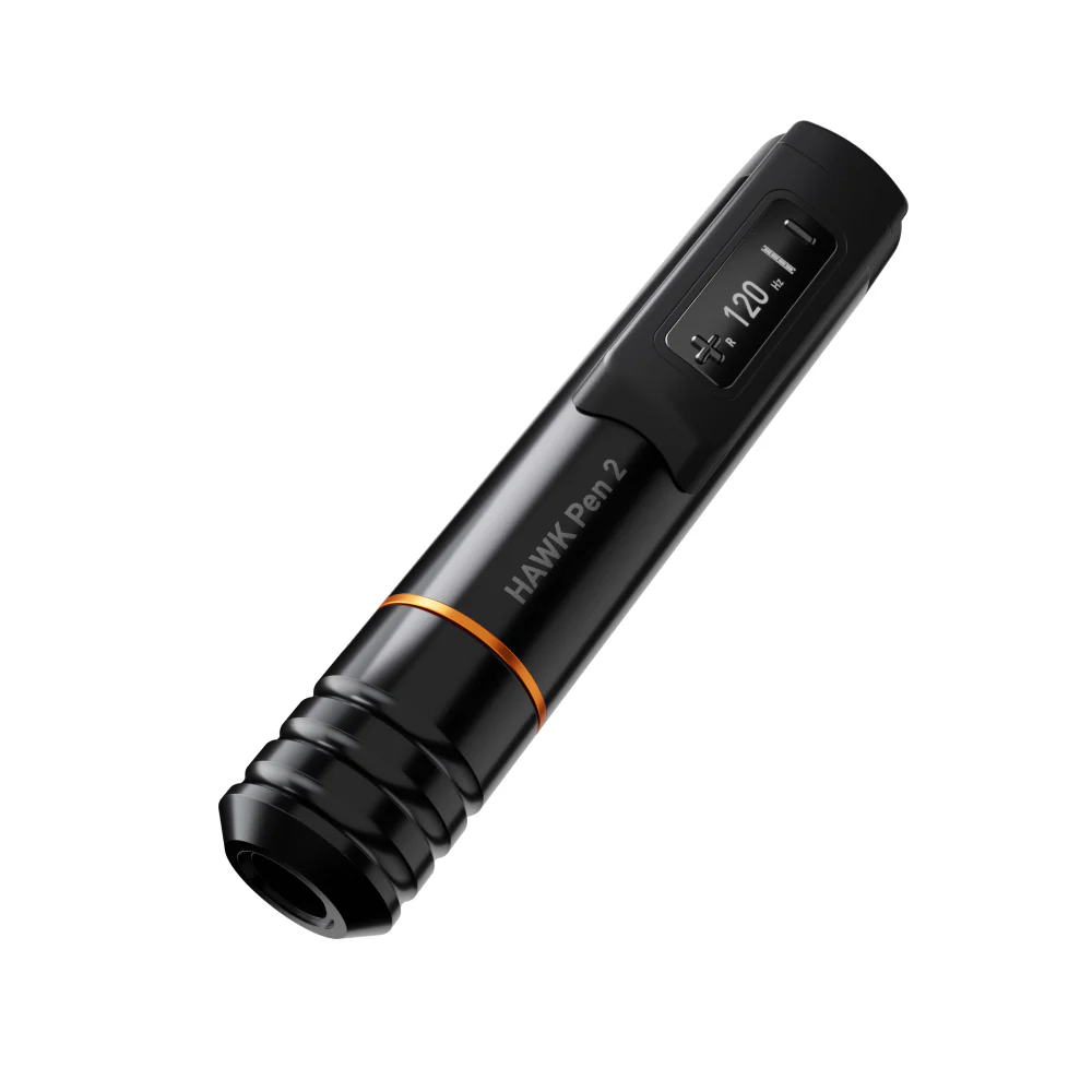 The Cheyenne HAWK Pen was the first modern rotary tattoo machine shaped like a pen. The new HAWK Pen 2 follows this award winning design that guarantees comfort during long sessions in a wireless version. It has an even stronger BLDC motor now and works in Steady and Responsive mode. The display shows clearly the frequency in Volts or Hz, the status of the battery and the current mode. The HAWK Pen 2 can easily be modified to personal preferences with different grip variations. And the 3.5mm stroke allows work in any style.